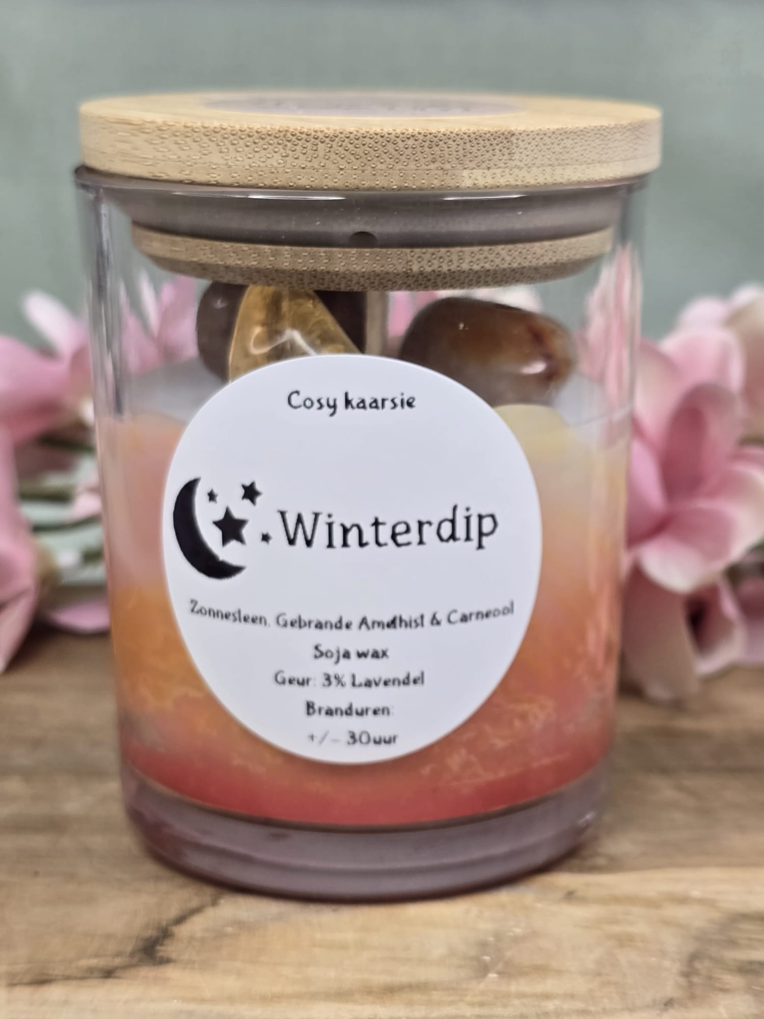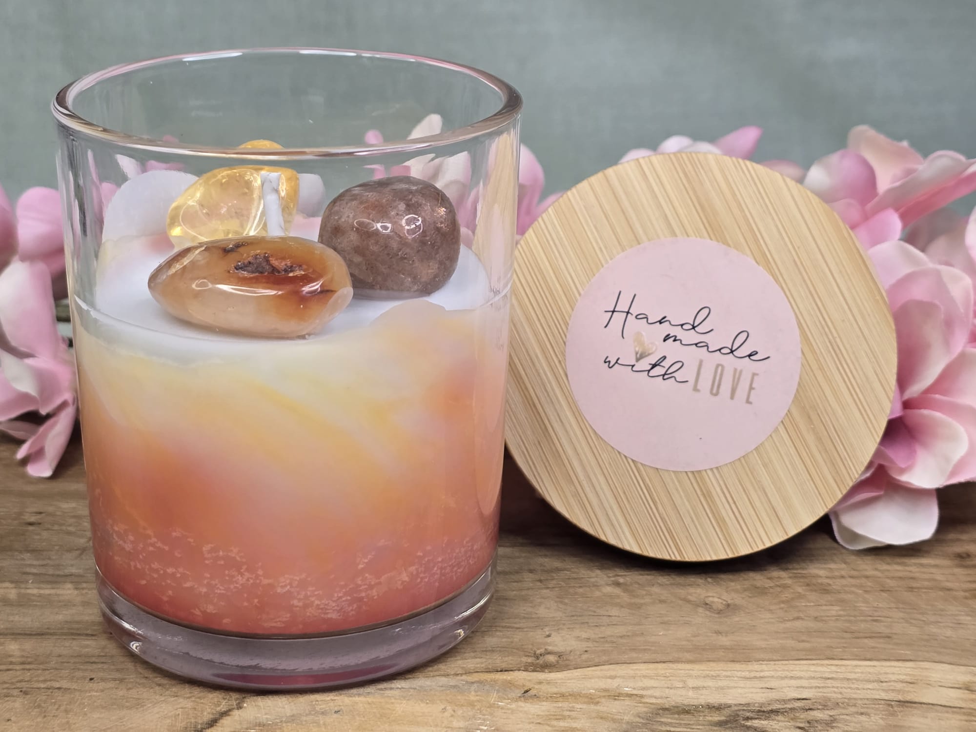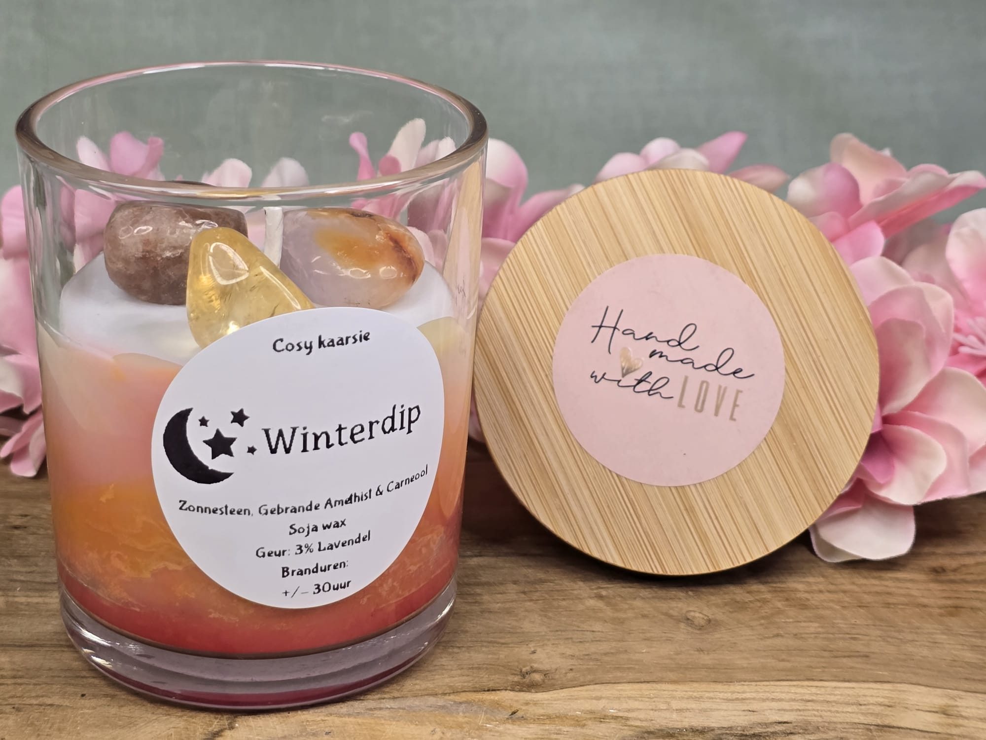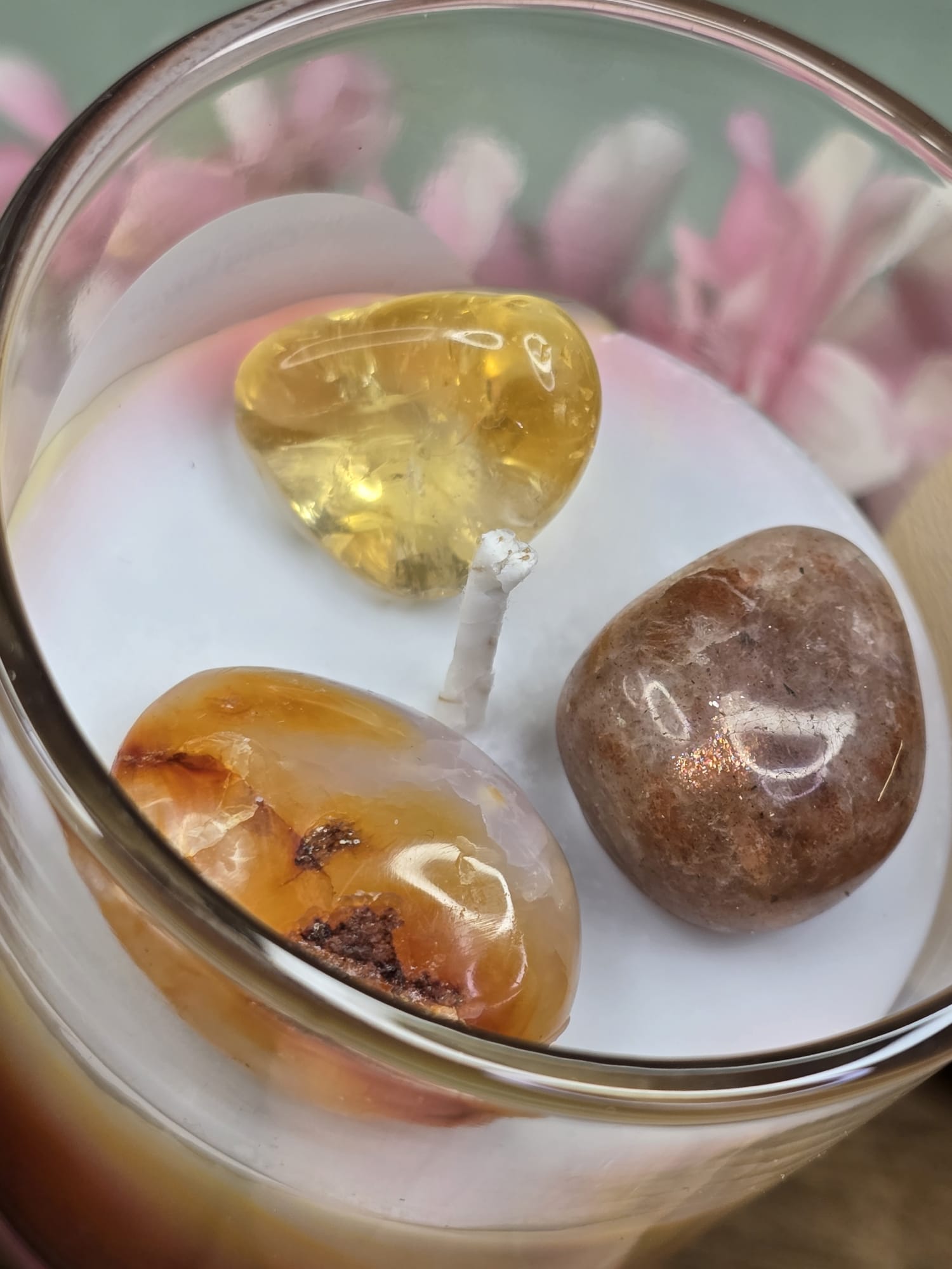 De kaars bevat drie krachtige stenen die bekend staan om hun positieve energie: